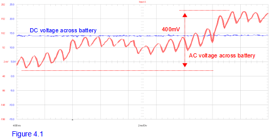 Figure 4.1 illustrates the AC content present on top of the DC voltage. The 400mV peak to peak, is an acceptable value for a good working system. More importantly the waveform shows no deformities, illustrating the integrity of the charging system, including the diode pack.