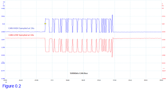 In Figure 0.1 you will see a sample of a CAN high speed bus. The CAN High signal (blue) is sampled at full bandwidth (20MHz) and the CAN Low signal (red) is restricted down to 100kHz.