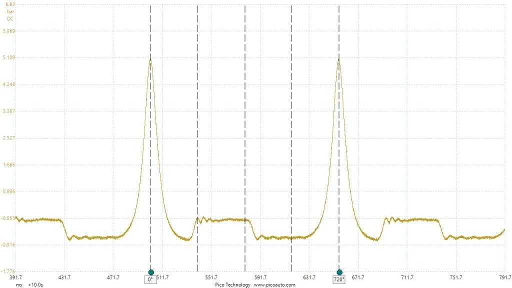Now you can see how the exhaust valve opening appears to be late, in comparison with the more common position’s I have captured. Of course I couldn’t condemn this as such, as it could be a particular characteristic of this engine, but the pattern didn’t look right. The garage went back and re-set the timing and I returned for another capture, as the vehicle was still not running right. The pattern was the same.