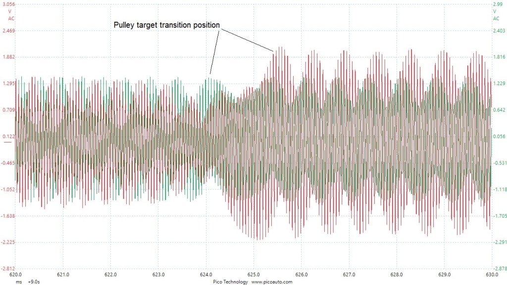 The section displayed is the transition phase as the camshaft pulley rotates the target block past the sensor.