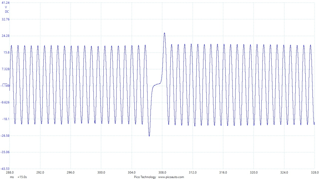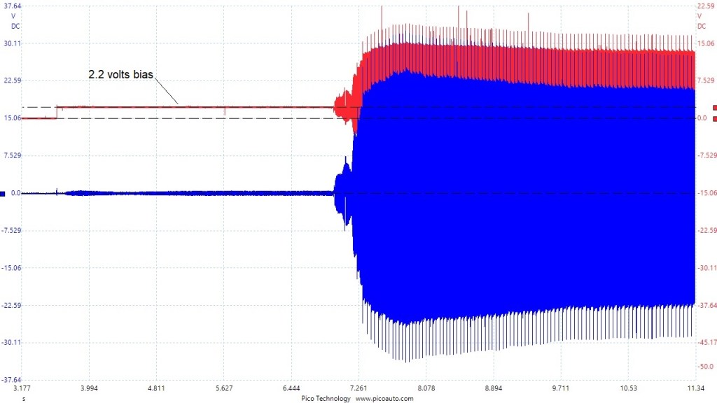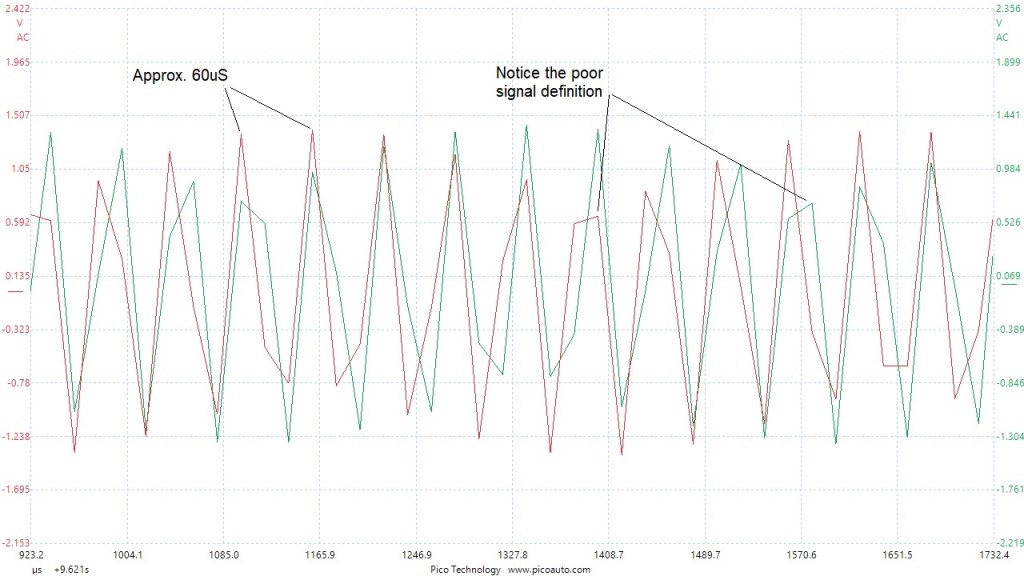 I have captured this using a common ground connection, (at the negative of the battery), and this sensor is a ‘floating ground’ sensor. The pattern is fine, but the amplitude is not accurate.