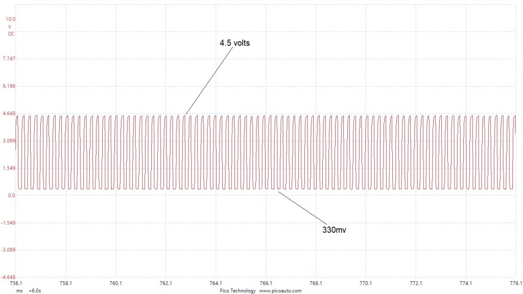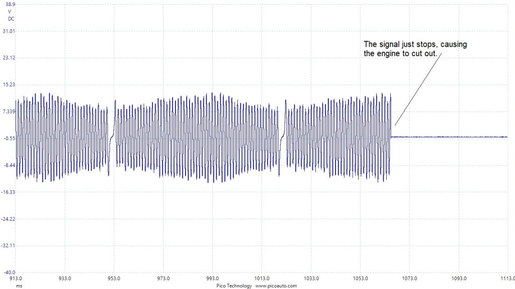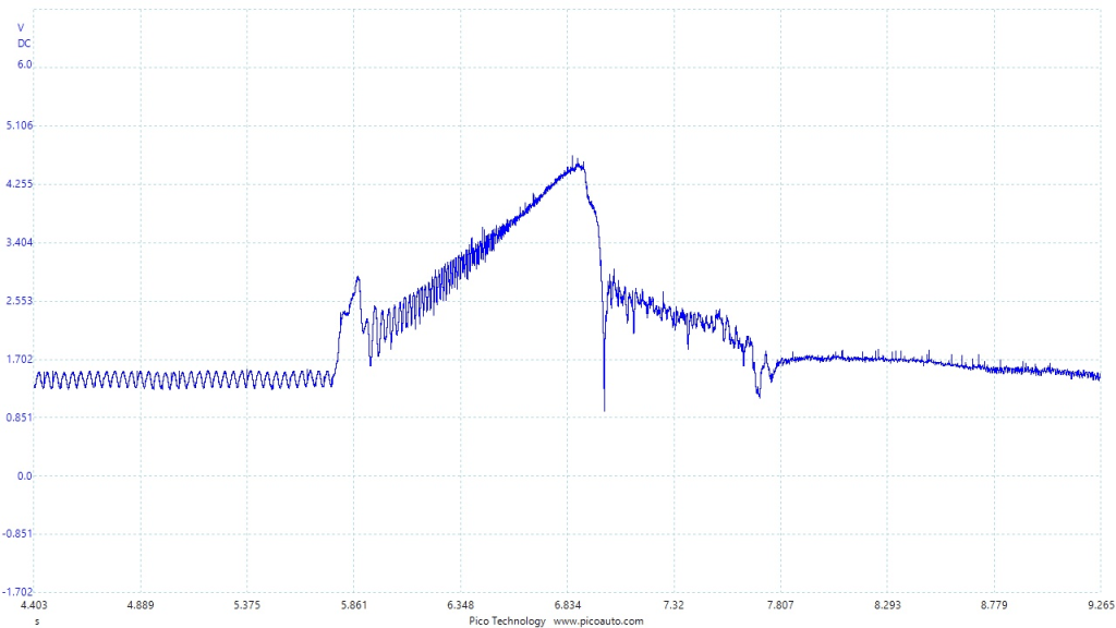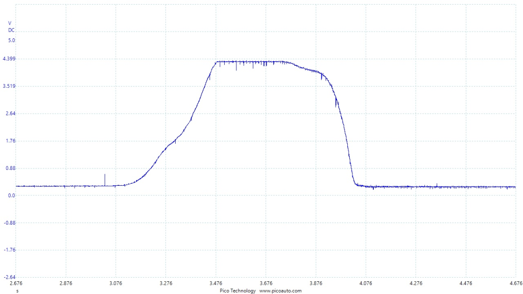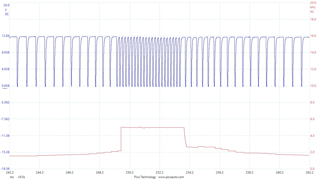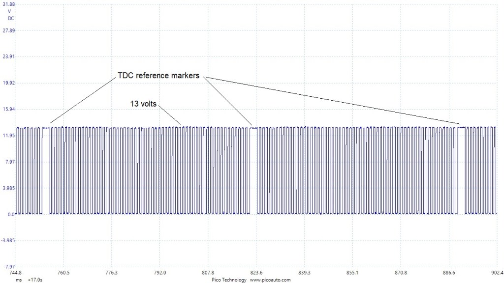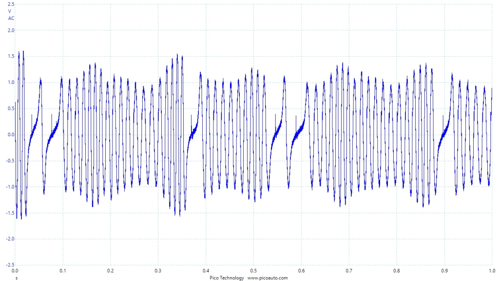 I captured it using a 2 sec/div setting, giving me 20 seconds of screen time, but I left the scope sampling rate at the standard default 1 mega-sample. That setting is normally fine for a good zoom function, when looking at cam and crank sensors and I only wanted to see the operation.