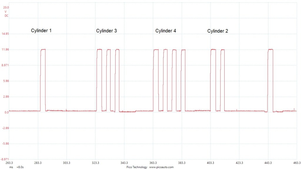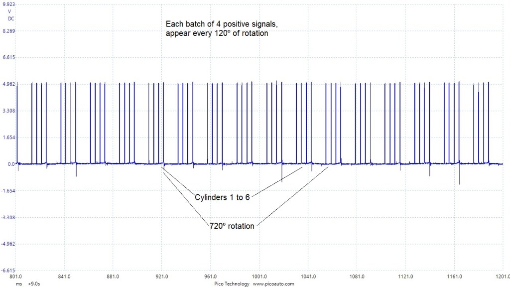 The sensor shown above, as you can see, uses an approximate 12 volt pull down signal. I find you don’t see too many signals that represent cylinder numbers, so clearly. The computer only needs to recognise a pattern in conjunction with a firing event. Mostly I find the sensors to use a 5 volt signal nowadays.