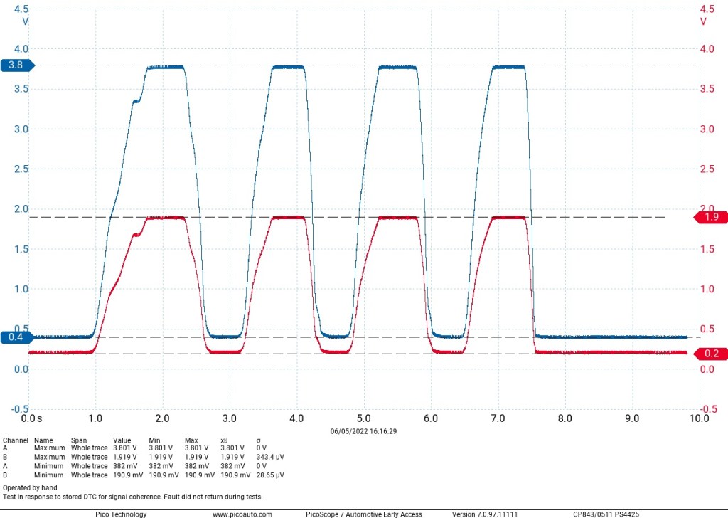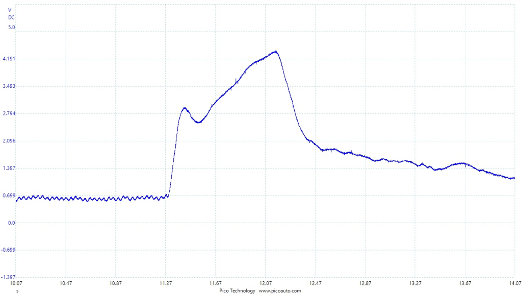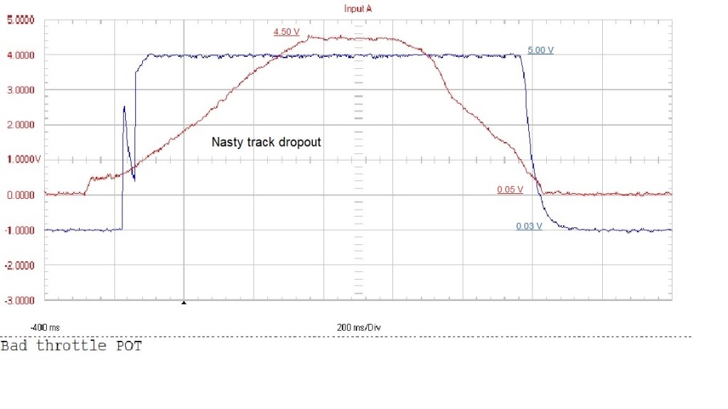 You can see in the above image, the two tracks respond differently. The blue channel, which sits at 0.3 volts for idle and rises to 4.9 volts for WOT. The red channel rises from 0.02 volts, at idle, to 4.4 volts WOT.