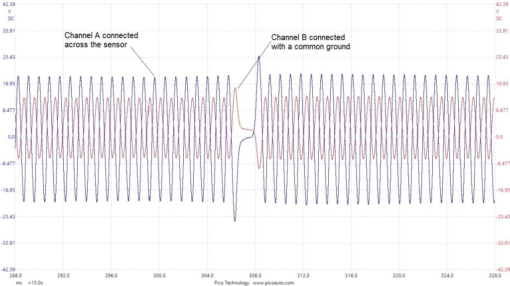 You can see how the negative side of the sensor, (in this case the red channel), is a mirror image of the positive side. Not all inductive sensors use a floating ground circuit, so always be aware.