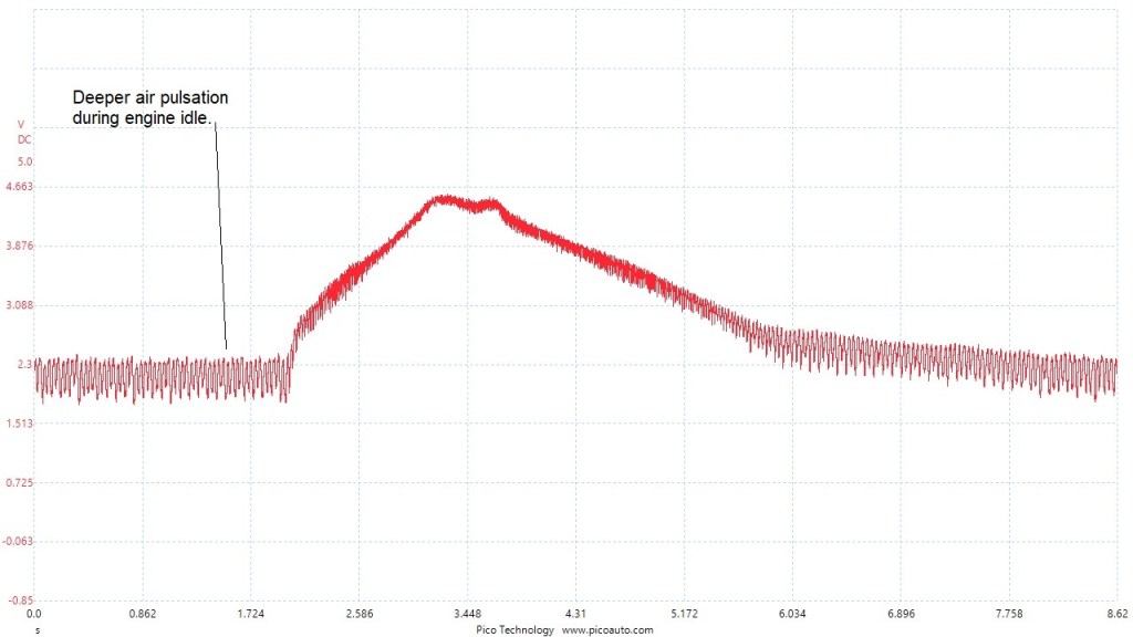 You can see how the profile is much less aggressive than with the petrol engine MAF. This is due to the absence of a throttle butterfly and so there is no sudden air movement. Also you will notice, that generally, the air pulsations are deeper during the no load condition at idle. Another diesel engine characteristic.