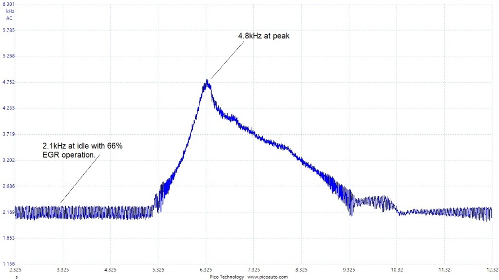 Lets have a look at this signal as it passes into a wide open throttle snap. I’ll only show the frequency signal.