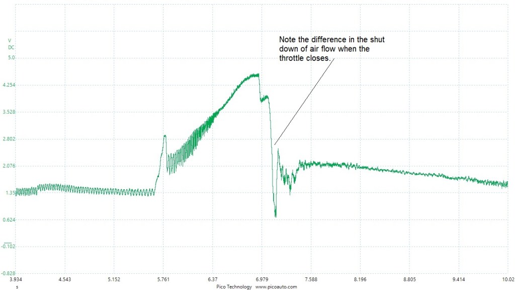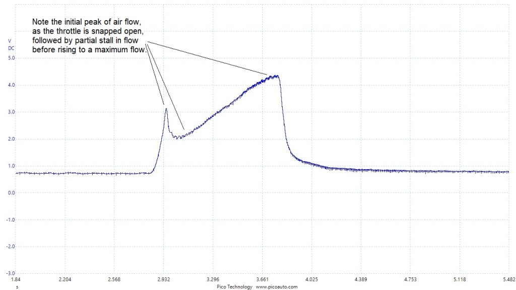 If we add in another channel, showing the accelerator pedal, we get better idea of progressive increase and decrease in air flow.