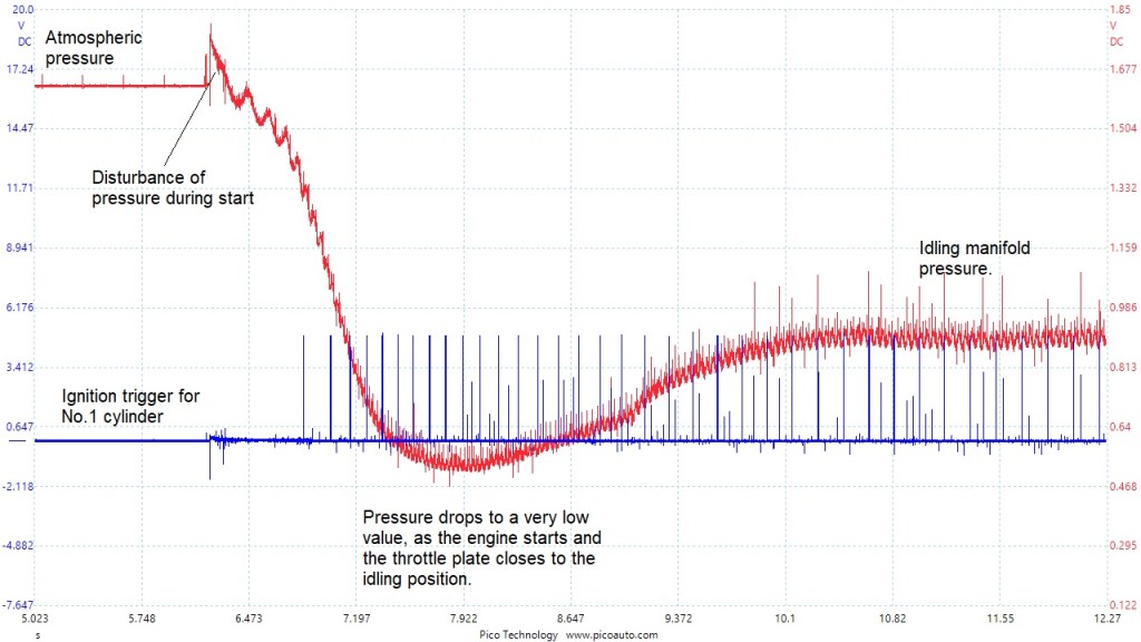 The next image shows a MAP signal during start-up. I’ve included the ignition trigger signal, to represent engine status.