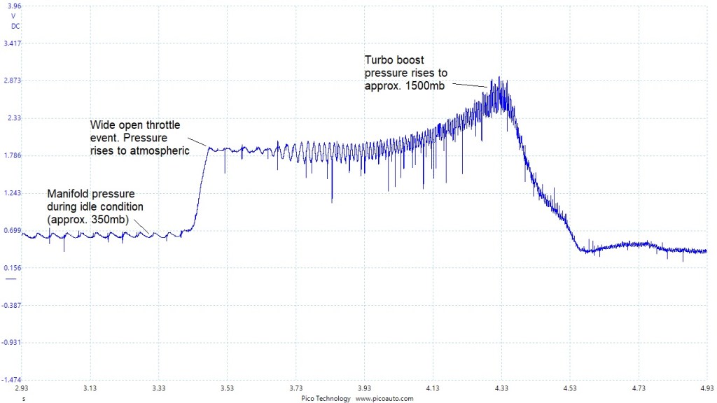 The following image shows a wide open throttle (WOT) burst, as in the first image. It shows how the manifold pressure rises to atmospheric pressure as the throttle butterfly opens. These images have all come from naturally aspirated engines.