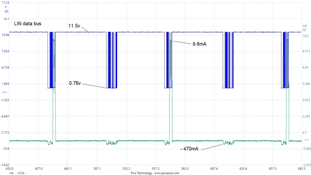FYI: This LIN data signal runs at an average of approximately 300Hz, with a peak data rate of about 9.6KHz, and I would describe it as an approximate 12v signal.