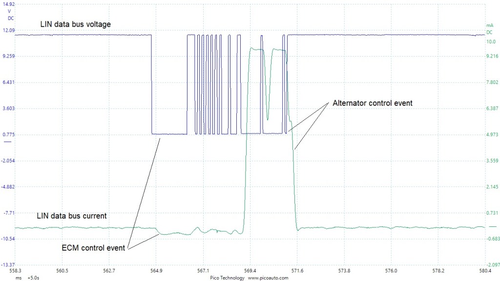 Because the ECM is responsible for providing the LIN signal, it takes very little current to switch the voltage from high to low. The alternator has to pull the voltage signal low and so requires more effort.